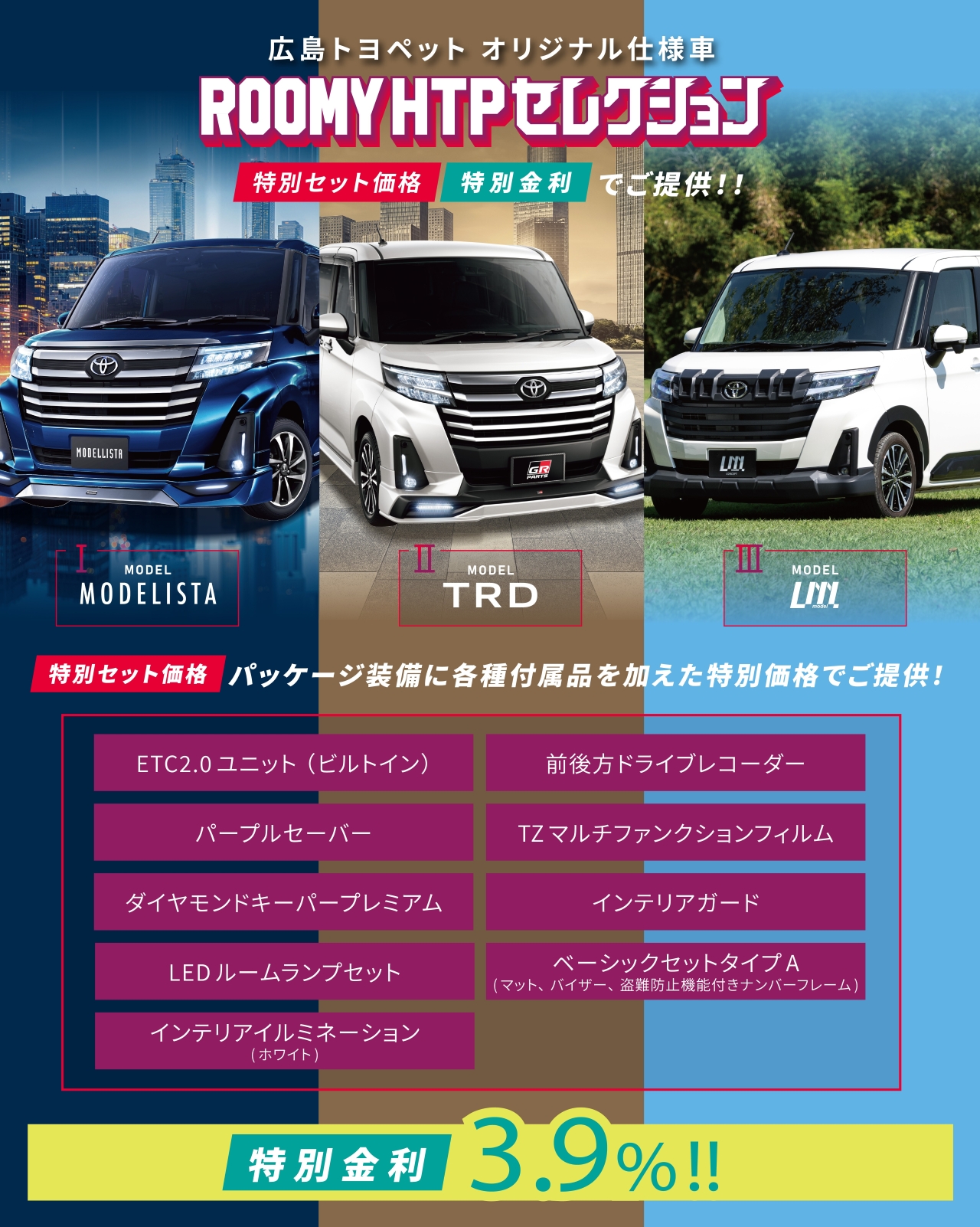 ※1.残額据置き払いプランは、車両返却時における車両の残存価値(据置き額)をあらかじめ設定し、その据置き額を除いた金額をお支払いいただくものです。据置き額の設定金額は契約期間によって異なります。設定した据置き額は、【据置き額保証条件】を満たす場合にのみ保証いたします。※2.広島トヨペットに車両をご返却の上、新車にお乗り換えの場合、および広島トヨペットに車両をご返却の場合、ご返却車両に関する残価設定型プランの最終回、残額据置き払いプランの2回目のお支払いは原則不要ですが、【残価・据置き額保証条件】を満たしていない場合には、車両の状態や走行距離の程度に応じて算定される精算金を別途ご負担いただきます。詳しくは店頭スタッフにお問い合わせ下さい。※3.お買い上げをご選択された場合、一括ご精算または分割払い(別途分割手数料が発生します)も選択できますが、別途条件がございます。※4.最終回のお支払金額を除く※5.残価設定型プランは、車両返却時における車両の残存価値(残価)をあらかじめ設定し、その残価を除いた金額をお支払いいただくものです。残価の設定金額は契約期間によって異なります。設定した残価は、【残価保証条件】を満たす場合にのみ保証いたします。※6.お買い上げをご選択された場合、最終回のお支払額(残価)を含めたお支払合計額は、一般的なクレジットの方がお安くなる場合があります。お買い上げの際に再クレジットも選択できますが別途条件がございます。